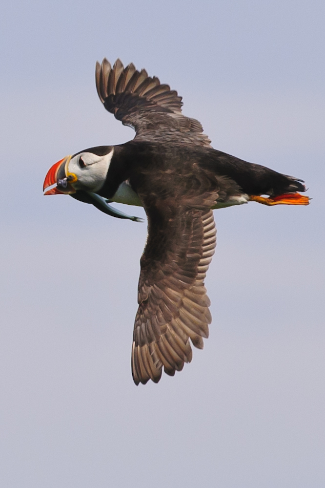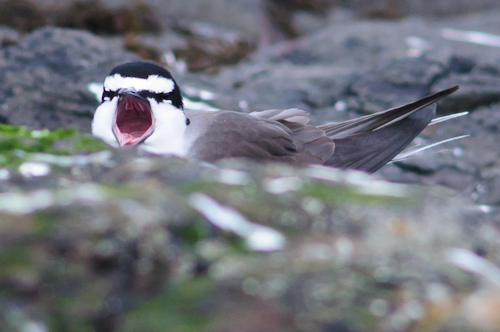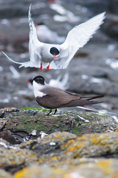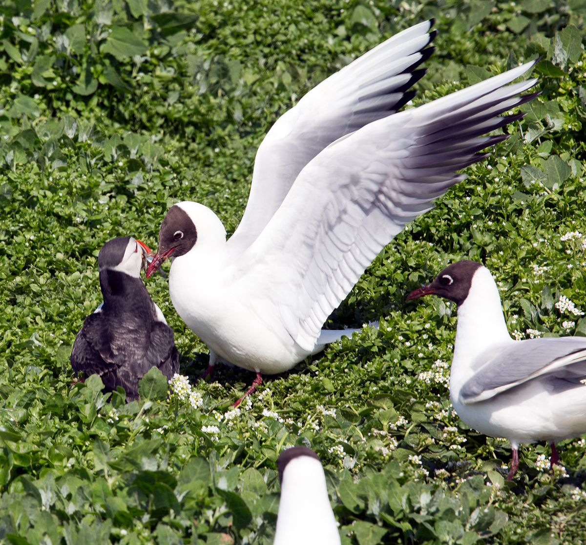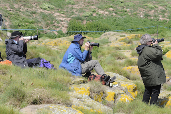 Lunch was followed by a trip to Inner Farne in a stiff cold breeze. The cliffs were echoing with the onomatopaeic calls of Kittiwake, Puffins, Guillemots and Razorbills were coming off the clifftops like guided missiles as they headed out to fish, Gannets soared effortlessly by on the breeze, Fulmars arced around the cliff faces on stiff wings, Grey Seals were hauled out, soaking up the rays, and Cormorant and Shag seemed to be causing confusion amongst some passengers on the boat. As we waited to land at the Inner Farne jetty, a call stood out from the general background mayhem of a seabird breeding colony; ‘choo-it, choo-it’, so distinctive, and a ghostly pale Roseate Tern flew just above our heads before landing with the Arctic, Sandwich and Common Terns roosting near the jetty. On the island we ducked to avoid the attention of some rather agitated Arctic Terns, and concentrated on Liz’s aim for the afternoon – getting a good photograph of a Puffin 🙂 There were plenty of obliging models to choose from, and we watched as birds returning to their burrows with beaks filled with sandeel were mobbed by Black-headed Gulls. After the chaos of the island, we finished the afternoon relaxing in the dunes at Bamburgh, eating carrot cake as Meadow Pipits and Skylarks sang and displayed in the sky around us 🙂